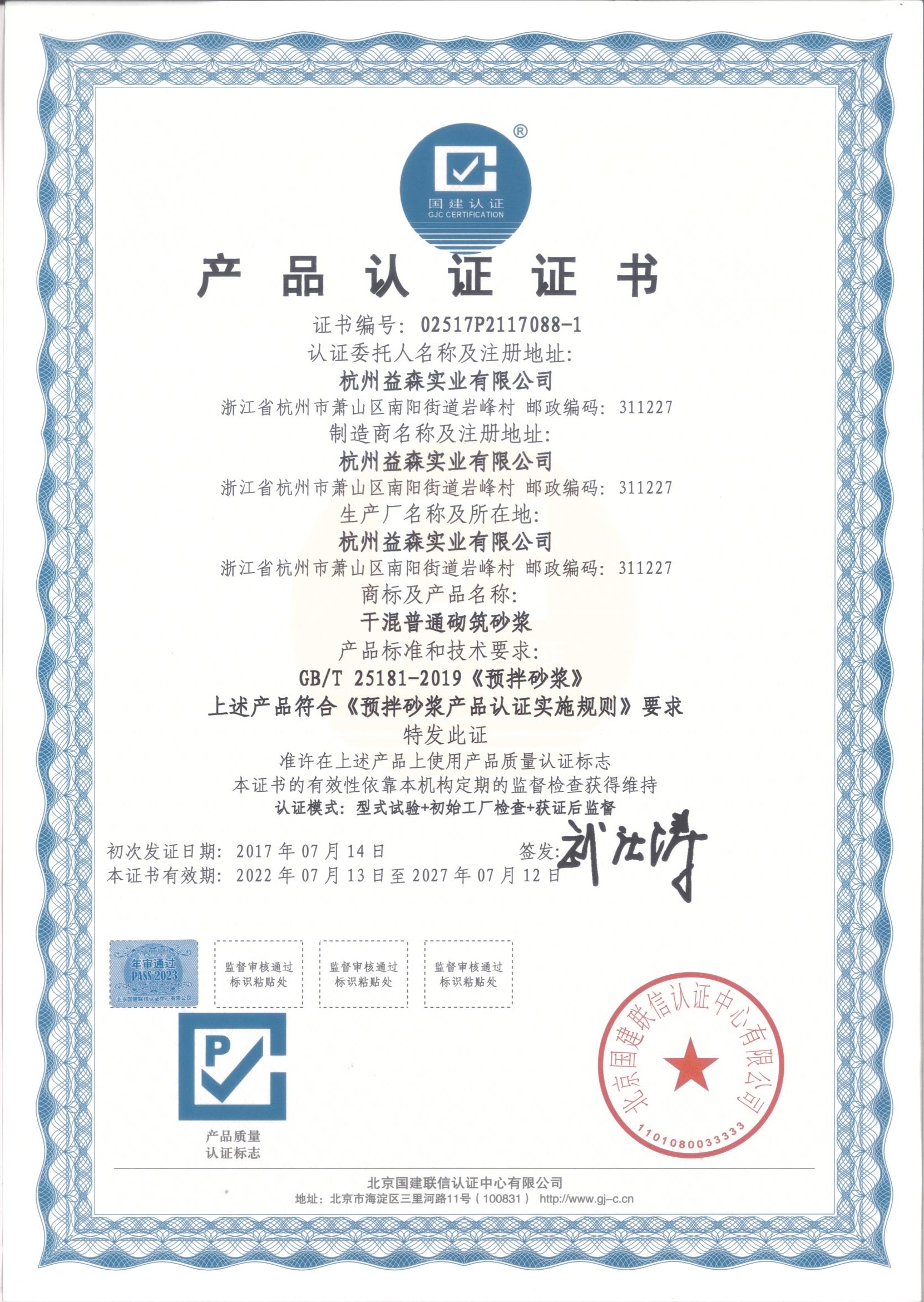 產(chǎn)品認(rèn)證證書(干混砌筑砂漿)