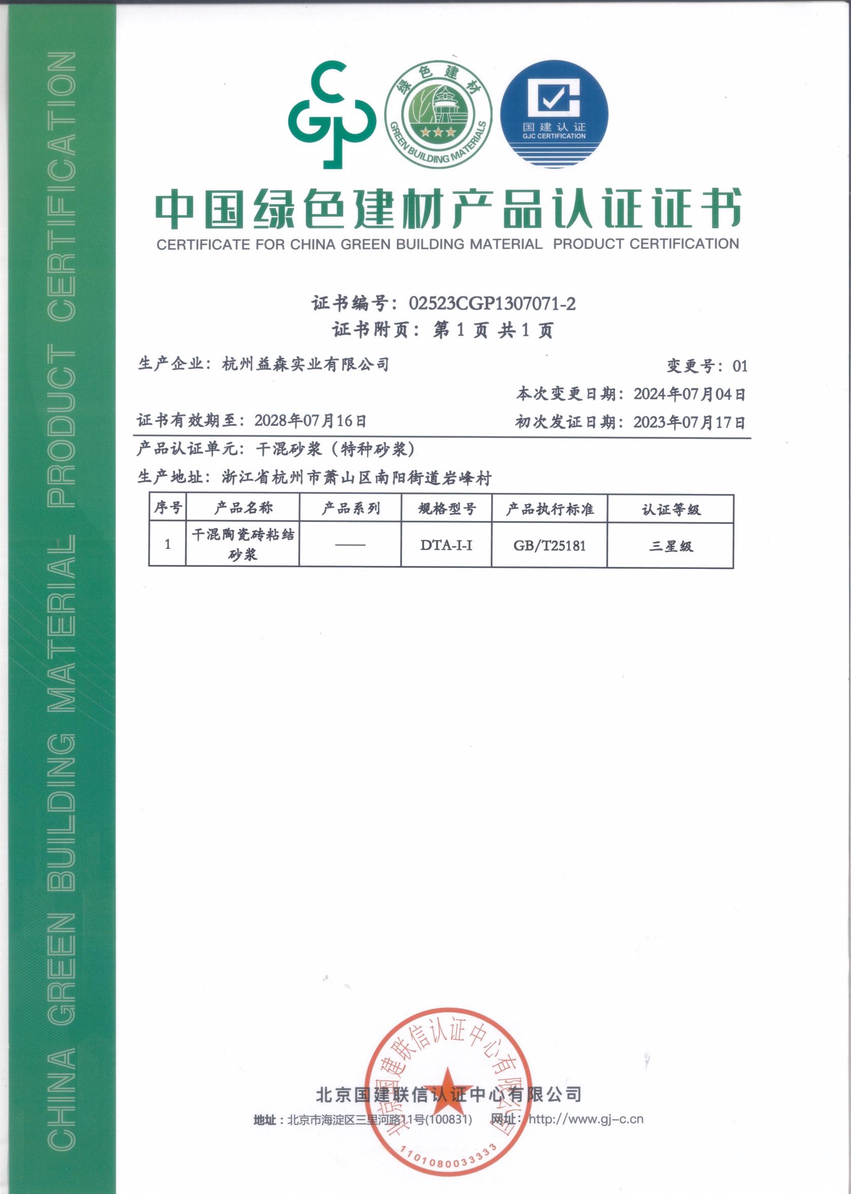 綠色建材認(rèn)證證書(特種砂漿001)