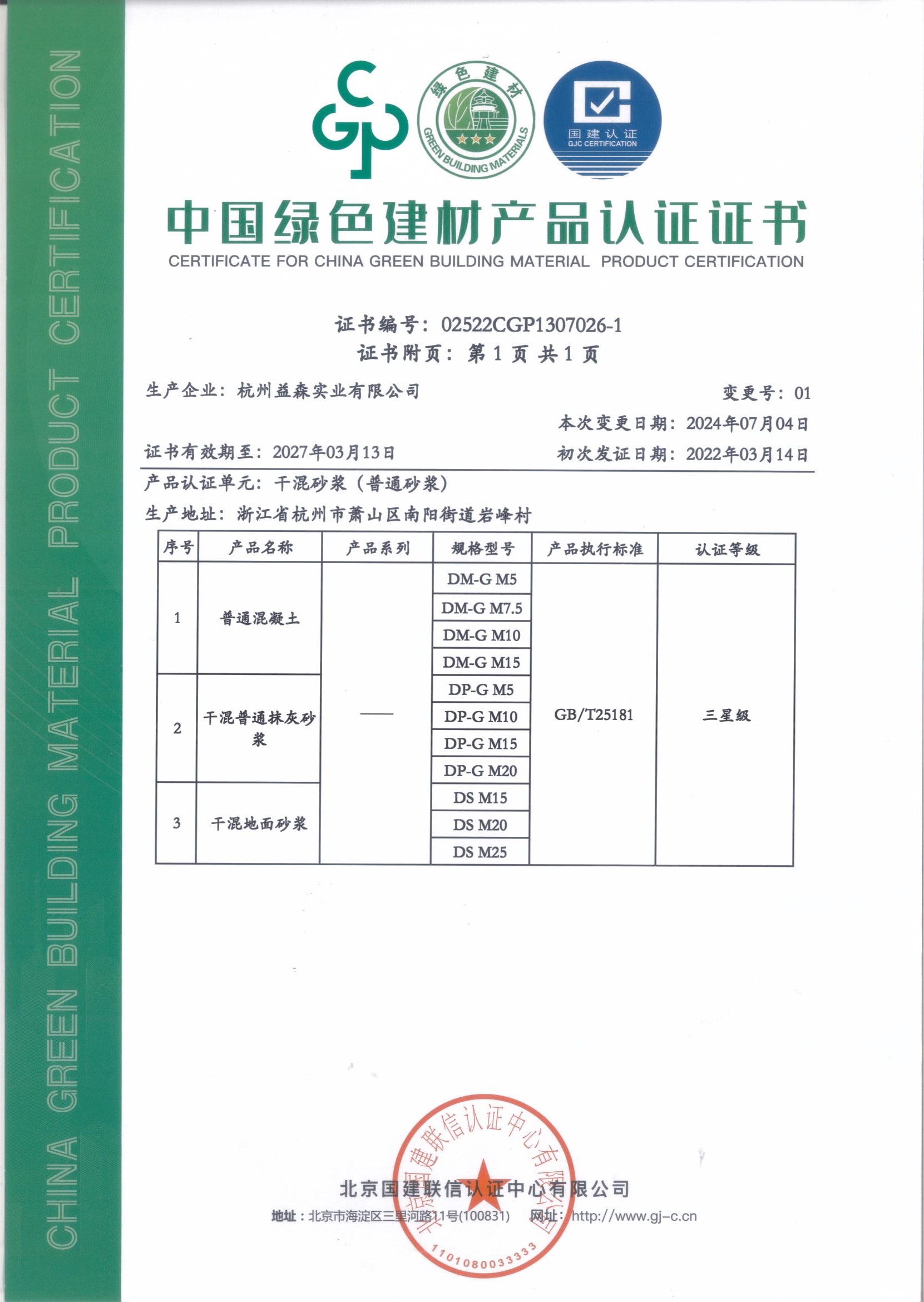 綠色建材認(rèn)證證書(普通砂漿001)